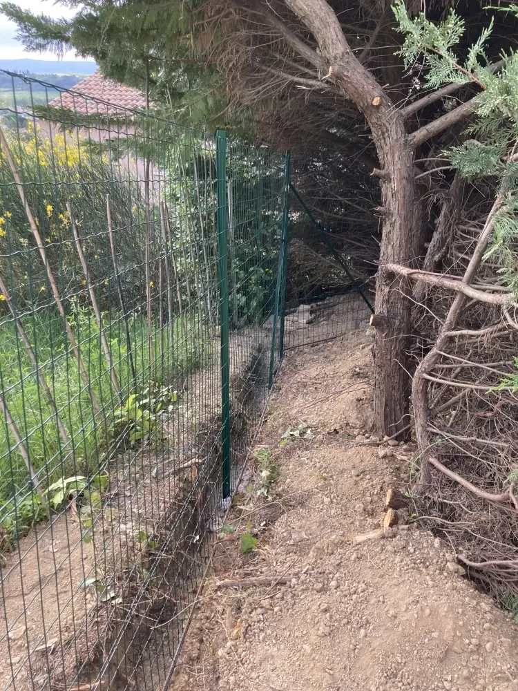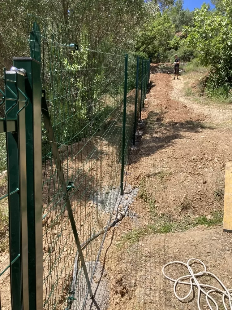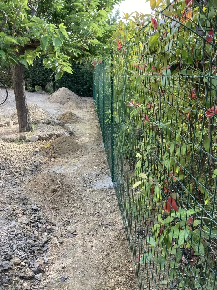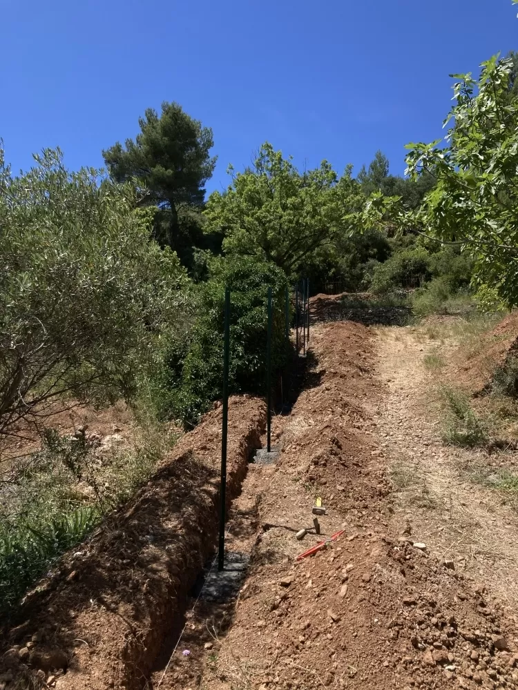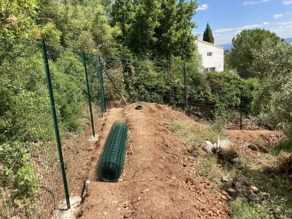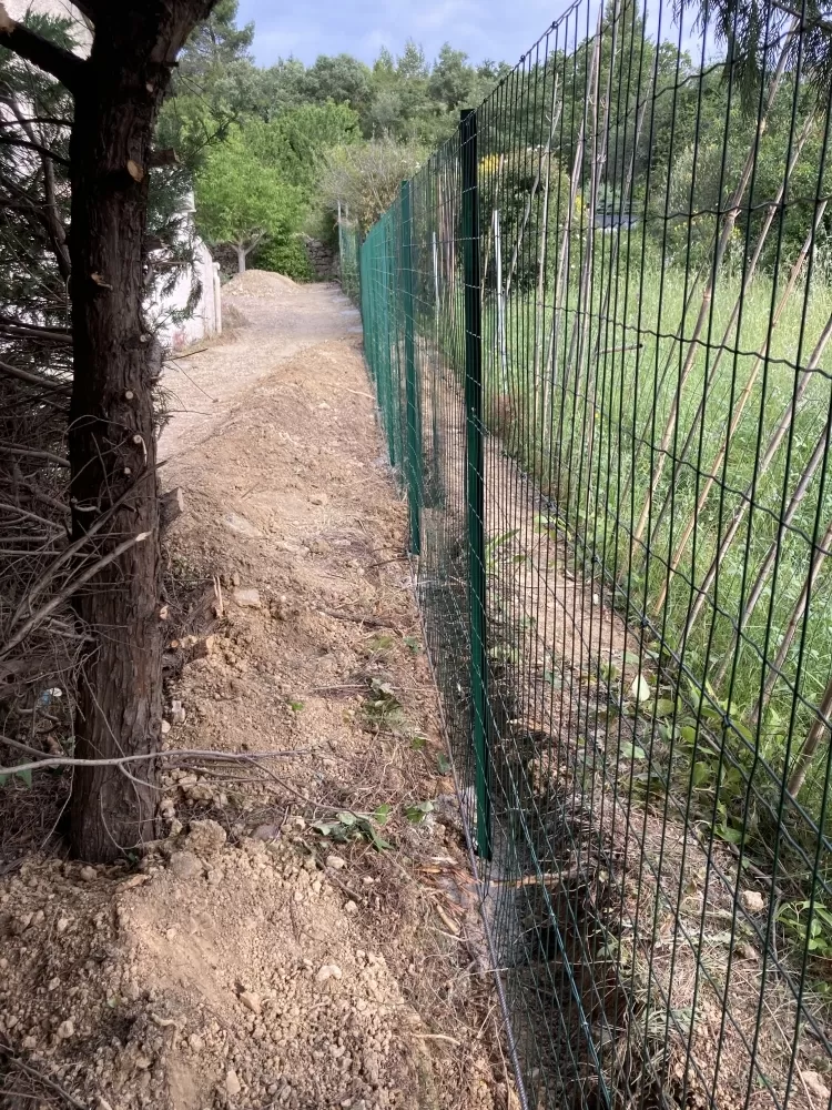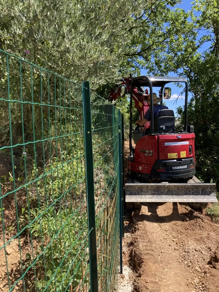 Votre entreprise d'aménagement extérieure à Nébian est intervenu sur demande d'un particulier pour la réalisation d'une clôture "anti sanglier" de 190 ml, après avoir déterminer les limites du terrain j'ai réalisé les tranchées avec ma pelleteuse afin de pouvoir encrer le grillage dans le sol. Ensuite avec l'aide du client nous avons effectués le scellement des poteaux, puis la pose du grillage ainsi que les barres de scellements et enfin nous avons remis en état le terrain.