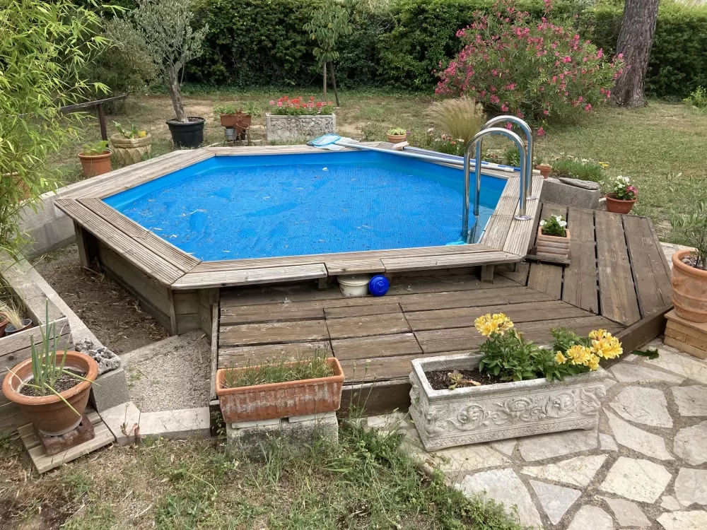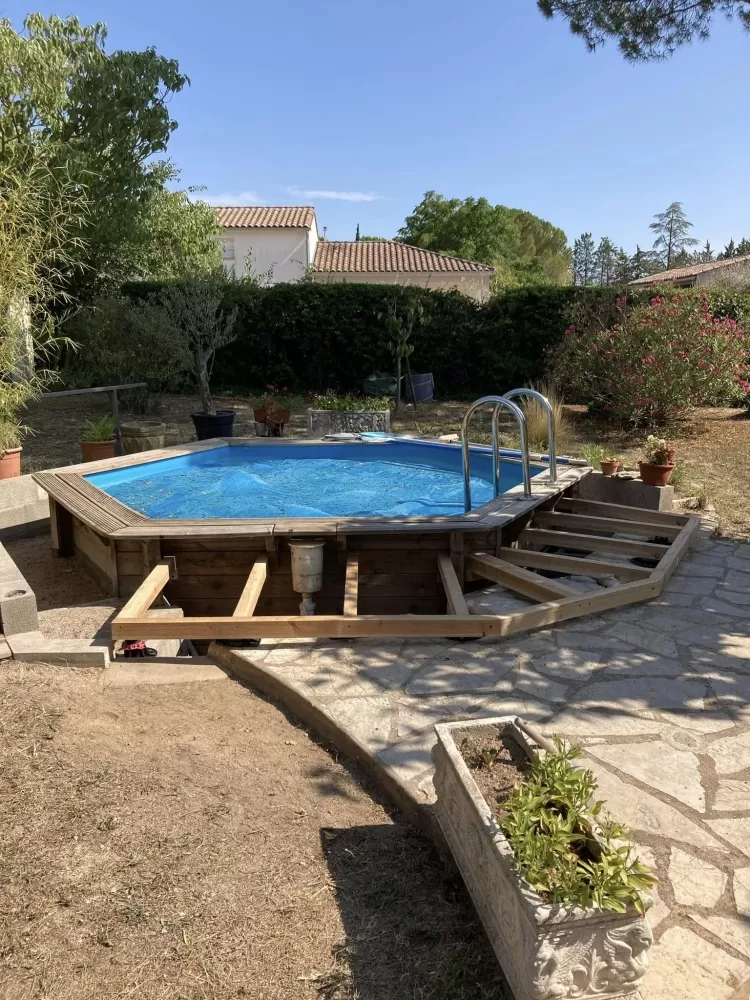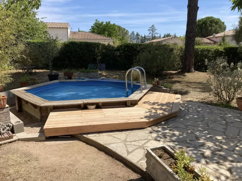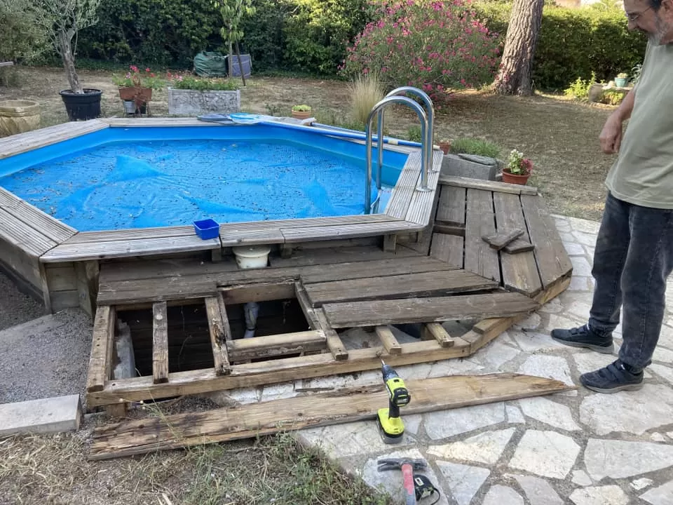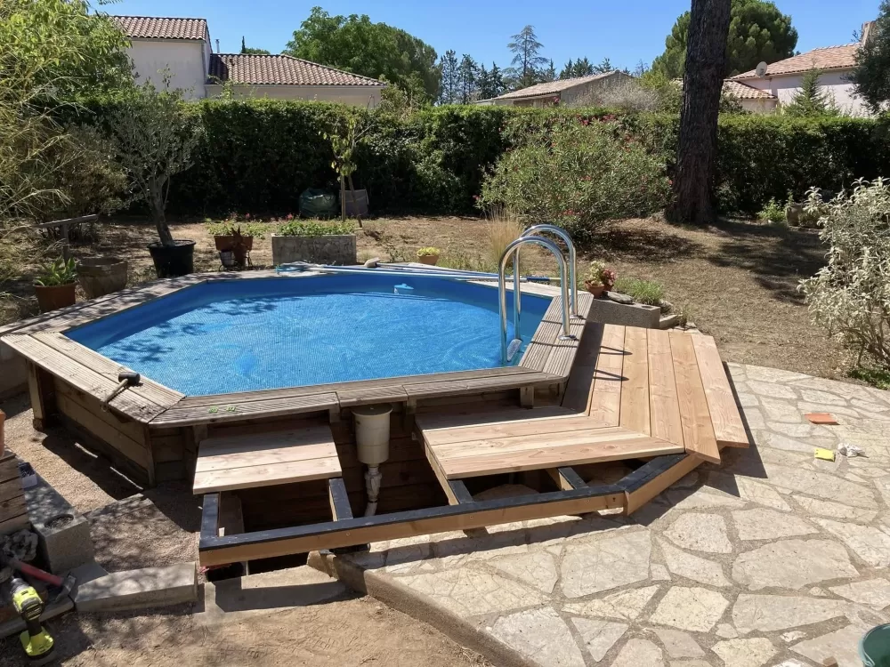 Rénovation de terrasse en bois autour d'une piscine à Pouzols par l'entreprise ABJ Environnement.