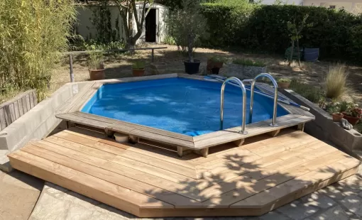 Rénovation de terrasse en bois autour d'une piscine à Pouzols par l'entreprise ABJ Environnement.
